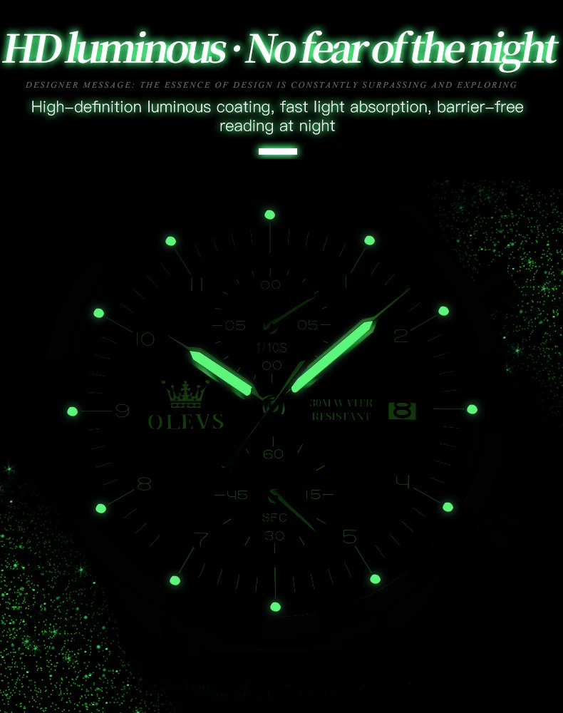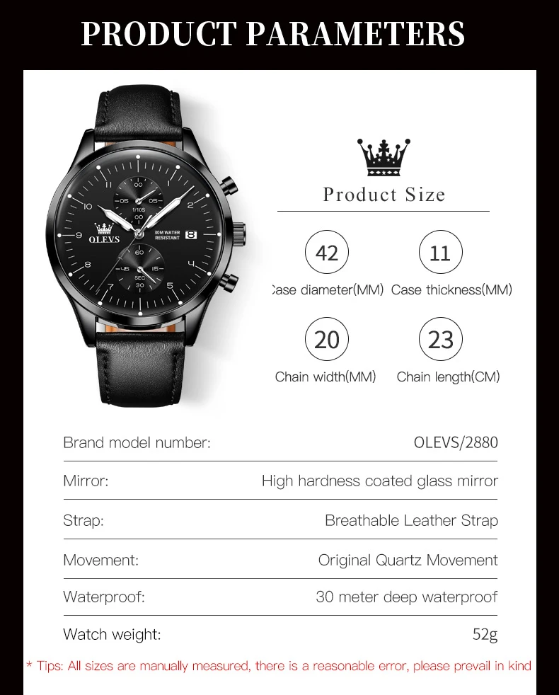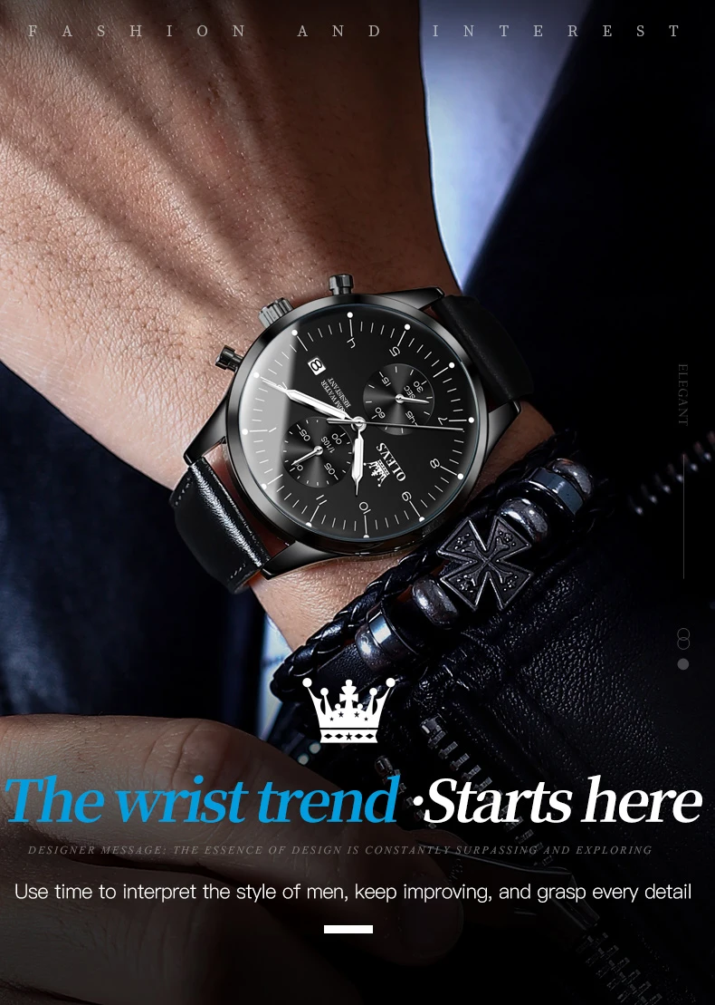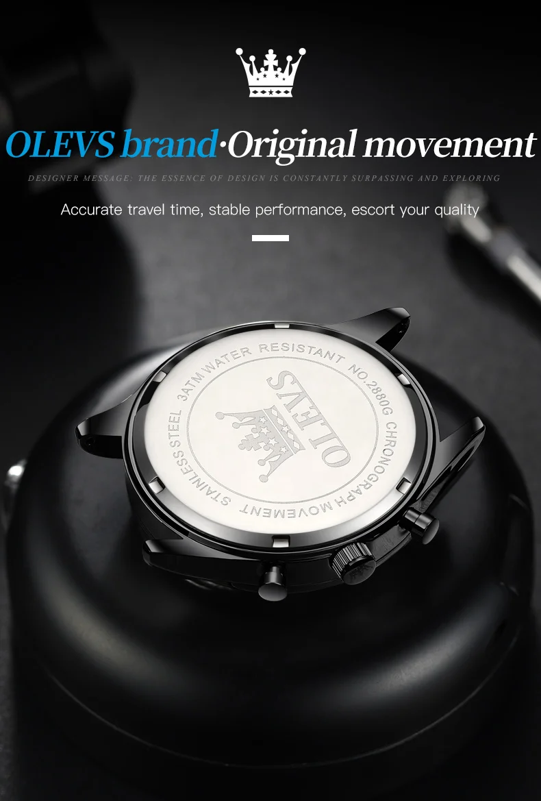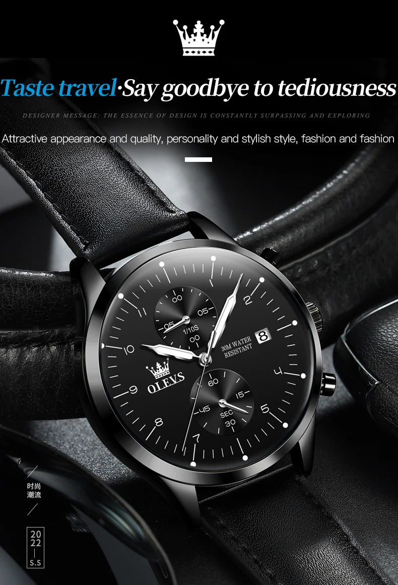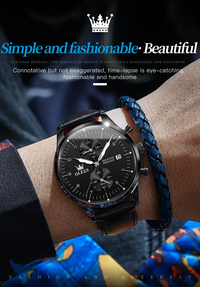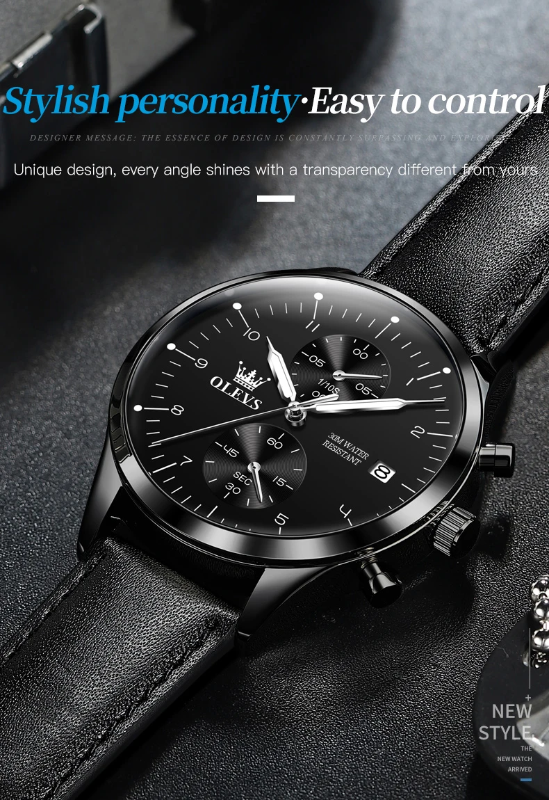 OLEVS casual fashion men's watches Chronograph 30m waterproof Leather strap quartz watch for man luminous genuine wristwatch